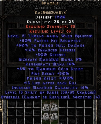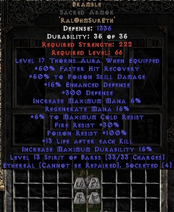 Bramble Sacred Armor - Ethereal - +50% PSD & 21 Thorns - Perfect