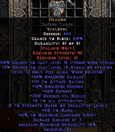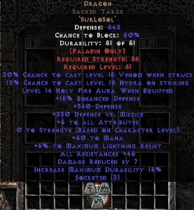 Dragon Sacred Targe 15%ed - 65% ED/121 AR - 3-4 All Stats |