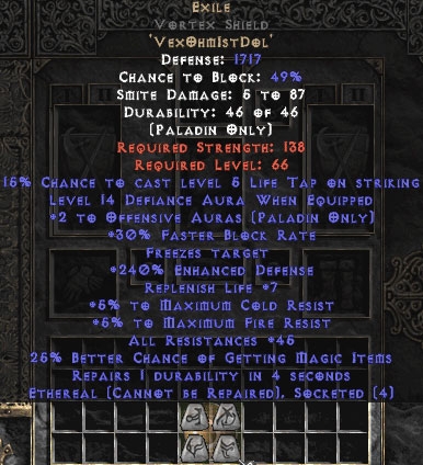 Exile Zakarum Shield - Eth Bugged - 45 Res All - 260% ED/16 Defiance - PerfectDelivery time 1-12 Hours |