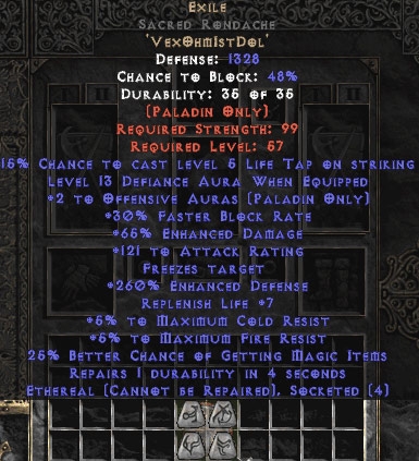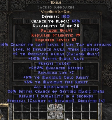 Exile Sacred Rondache - Eth Bugged - 45 Res All - 260% ED/16 Defiance - Perfect |