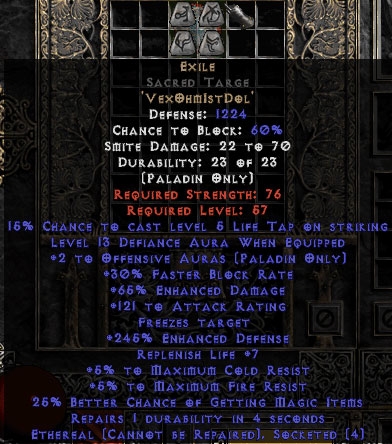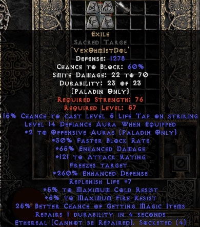 Exile Sacred Targe - Eth Bugged - 45 Res All - 260% ED/16 Defiance - PerfectDelivery time 1-12 Hours |