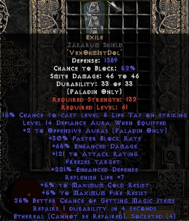 Exile Zakarum Shield - Eth Bugged - 65% EDam/121 AR - 260% EDef/16 Defiance - Perfect |