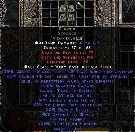 Diablo 2 Phoenix Scourge - 415% ED/400 DvM/21 FA/15 Red - Perfect kaufen
