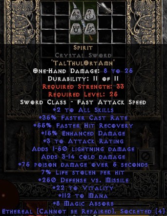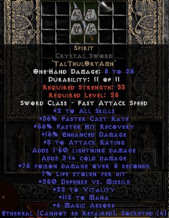 Spirit Crystal Sword - Ethereal - 30-34% FCR/89-112 Mana/3-8 MALieferzeit: 1-12 Stunden |