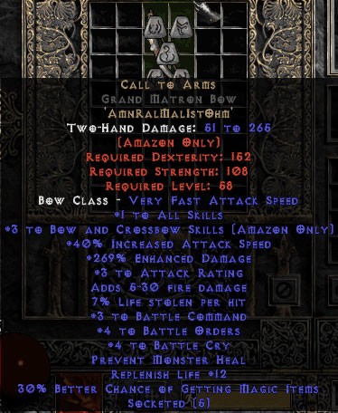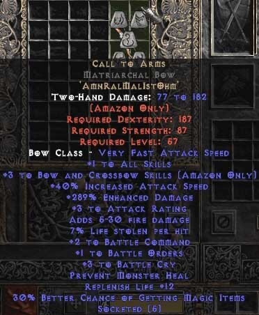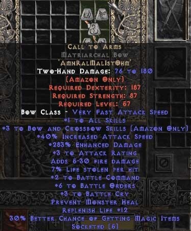 Call to Arms Matriachal Bow - +6 BO/+6 BC/+4 BCry/305% ED - Perfect |