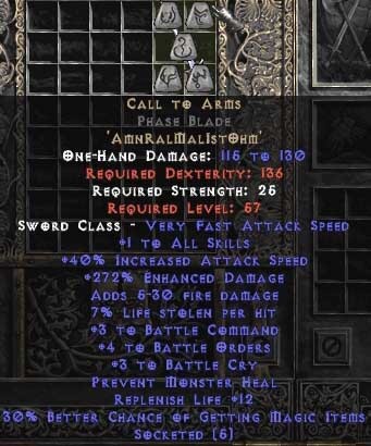 Call to Arms Phase Blade - +6 BO/+6 BC/+4 BCry/305% ED - Perfect |