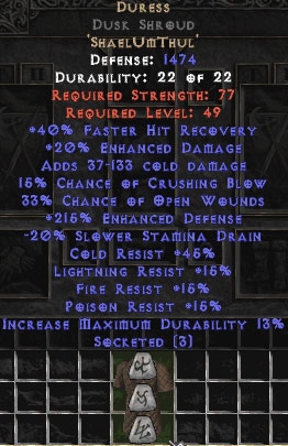 Buy Diablo II Duress Dusk Shroud - 215% Edef & 20% Edam - Perfect