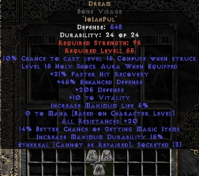 Buy Diablo II Dream Bone Visage 15%ed - Ethereal - 20 Resist All/20-29% FHR/12-24% MF/200-219 Def