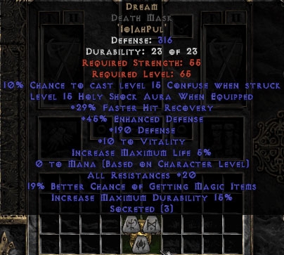 Buy Diablo II Dream Death Mask 15%ed - 20 Resist All/20-29% FHR/12-24% MF/150-199 Def