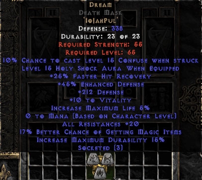 Buy Diablo II Dream Death Mask 15%ed - 20 Resist All/20-29% FHR/12-24% MF/200-219 Def