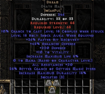 Buy Diablo II Dream Death Mask 15%ed - 20 Resist All/20-29% FHR/25% MF/220 Def
