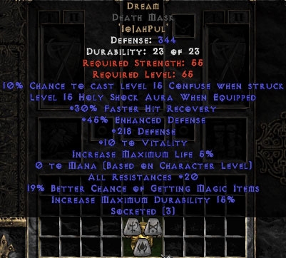 Buy Diablo II Dream Death Mask 15%ed - 20 Resist All/30% FHR/12-24% MF/200-219 Def