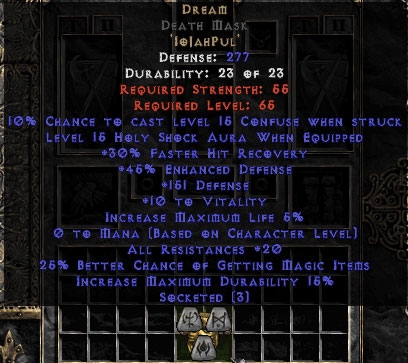 Buy Diablo II Dream Death Mask 15%ed - 20 Resist All/30% FHR/25% MF/150-199 Def