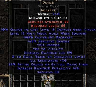 Buy Diablo II Dream Death Mask 15%ed - 20 Resist All/30% FHR/25% MF/200-219 Def