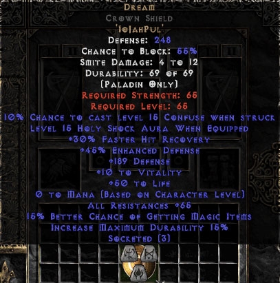 Buy Diablo II Dream Crown Shield 65%ED/121 AR - 20 Resist All/30% FHR/12-24% MF/150-199 Def