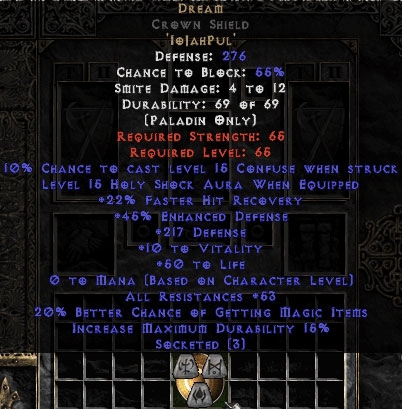 Buy Diablo II Dream Crown Shield 65%ED/121 AR - 5-19 Resist All/20-30% FHR/12-25% MF/150-220 Def