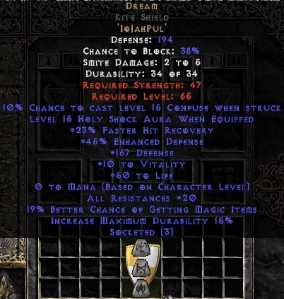 Diablo 2 Dream Kite Shield 15%ed - 20 Resist All/20-29% FHR/12-24% MF/150-199 Def kaufen