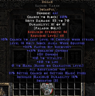 Buy Diablo II Dream Sacred Targe 15%ed - 45 Res All - 20 Resist All/20-29% FHR/12-24% MF/200-219 Def