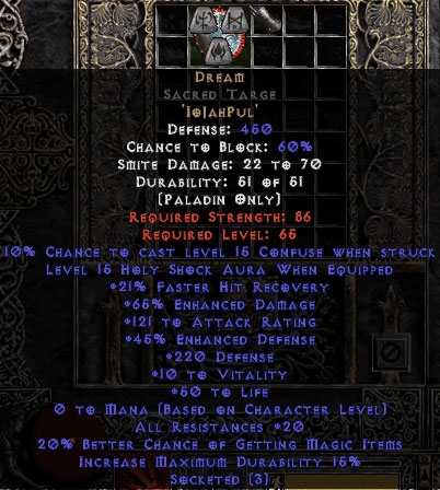 Buy Diablo II Dream Sacred Targe - 65%ED/121 AR - 20 Resist All/20-29% FHR/12-24% MF/220 Def