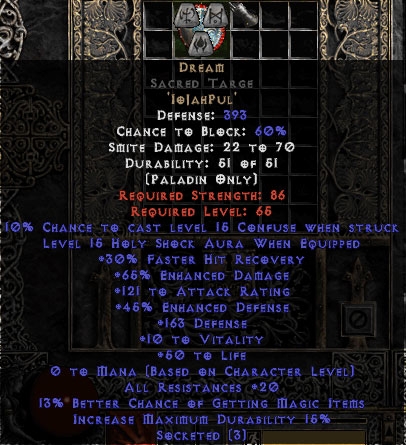 Buy Diablo II Dream Sacred Targe - 65%ED/121 AR - 20 Resist All/30% FHR/12-24% MF/150-199 Def