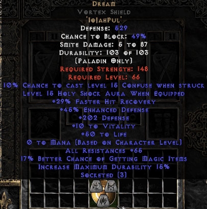 Buy Diablo II Dream Vortex Shield 15%ed - 45 Res All - 20 Resist All/20-29% FHR/12-24% MF/200-219 Def