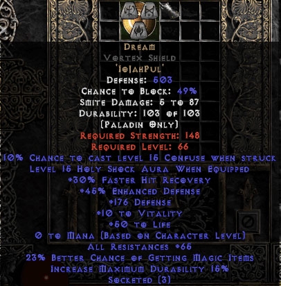 Buy Diablo II Dream Vortex Shield 15%ed - 45 Res All - 20 Resist All/30% FHR/12-24% MF/150-199 Def