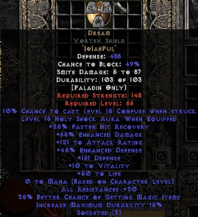 Diablo 2 Dream Vortex Shield - 65%ED/121 AR - 20 Resist All/20-29% FHR/25% MF/150-199 Def kaufen