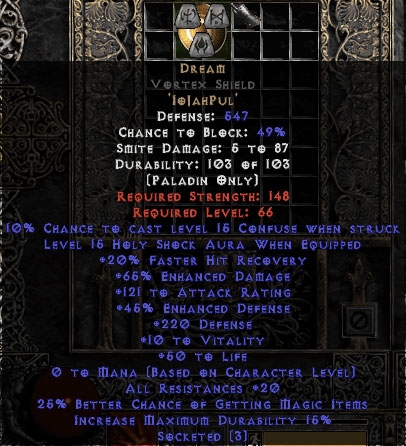 Buy Diablo II Dream Vortex Shield - 65%ED/121 AR - 20 Resist All/20-29% FHR/25% MF/220 Def