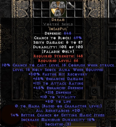 Buy Diablo II Dream Vortex Shield - 65%ED/121 AR - 20 Resist All/30% FHR/12-24% MF/200-219 Def
