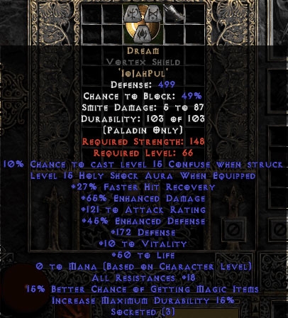 Buy Diablo II Dream Vortex Shield - 65%ED/121 AR - 5-19 Resist All/20-30% FHR/12-25% MF/150-220 Def