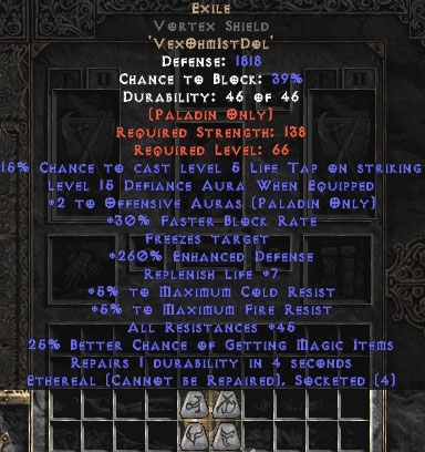 Diablo 2 Exile Vortex Shield - Eth Bugged - 45 Res All - 260%/16 Defiance - 1818 Defense - Perfect kaufen