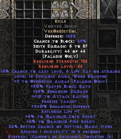 Diablo 2 Exile Vortex Shield - Eth Bugged - 65% ED/121 AR - 240-259% EDef kaufen