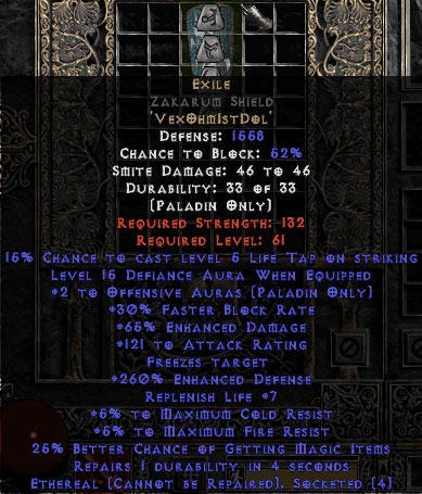 Diablo 2 Exile Zakarum Shield - Eth Bugged - 65% ED/121 AR - 260% EDef kaufen