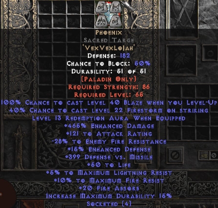 Buy Diablo II Phoenix Sacred Targe - 121 AR - 465% ED/350-399 DvM/15-21 FA/10-15 Red