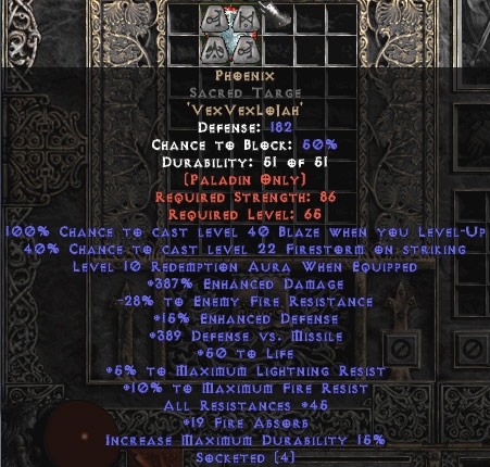 Buy Diablo II Phoenix Sacred Targe 15%ed - 45 Res All - 380-399% ED/350-400 DvM/15-21 FA/10-15 Red