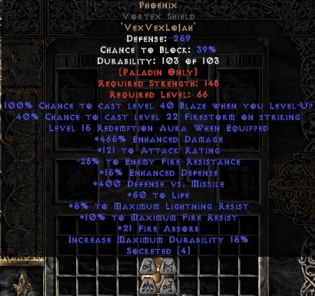 Diablo 2 Phoenix Vortex Shield - 121 AR - 465% ED/400 DvM/21 FA/15 Red - Perfect kaufen