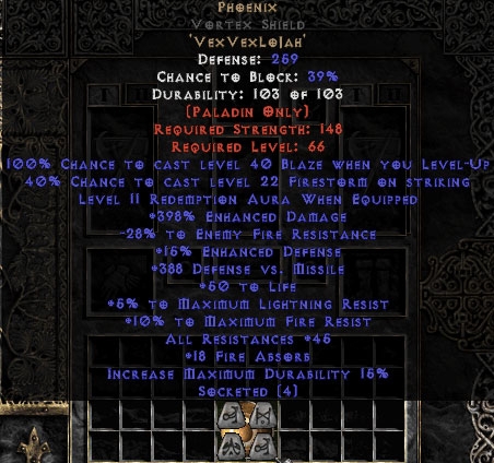 Buy Diablo II Phoenix Vortex Shield 15%ed - 45 Res All - 380-399% ED/350-400 DvM/15-21 FA/10-15 Red