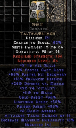 Buy Diablo II Spirit Monarch 15%ed - 25-29% FCR/89-112 Mana/3-8 MA