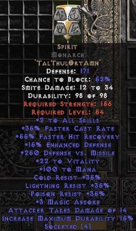 Buy Diablo II Spirit Monarch 15%ed - 35% FCR/89-111 Mana/3-8 MA