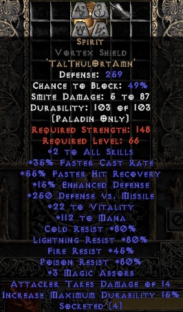Buy Diablo II Spirit Vortex Shield 15%ed - 45 Res All - 35% FCR/112 Mana/3-7 MA
