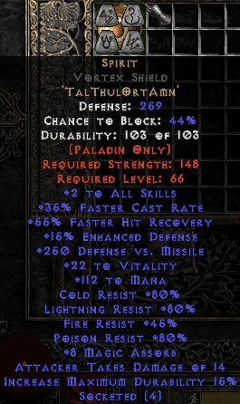 Buy Diablo II Spirit Vortex Shield 15%ed - 45 Resist All - 35% FCR/112 Mana/8 MA - Perfect